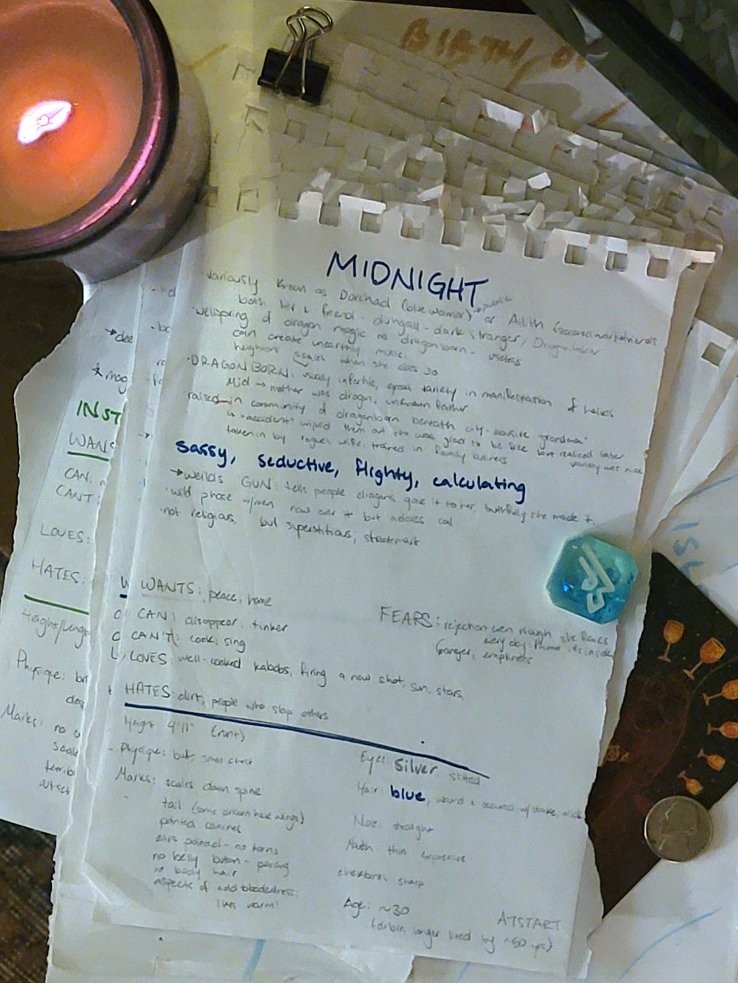 If you can read it, you’ll find a lot of character-creation classics, like the character’s fears, wants, cans, can’ts, and physical details. There are also some fun details like: